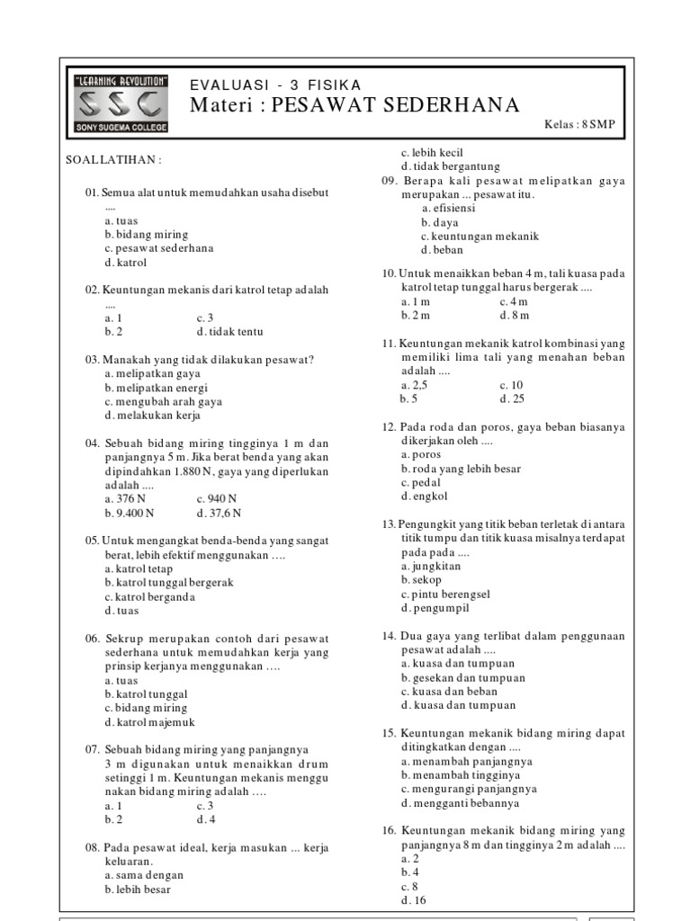 Selain itu, mereka bisa menghitung keuntungan mekanik semua alat tersebut. Pesawat sederhana adalah suatu alat yang digunakan untuk mempermudah melakukan usaha. Sekian dulu materi kali ini, bagikan agar teman yang lain bisa membacanya. Peralatan pesawat sederhana, seperti (a)tuas, (b)katrol, dan (c)bidang miring. Hal ini untuk memudahkan para pengguna jalan melewati jalan menanjak. Baut atau sekrup adalah suatu batang atau tabung dengan alur heliks pada permukaannya. Keuntungan mekanis bidang miring adalah. Sekrup merupakan contoh dari pesawat sederhana untuk memudahkan kerja yang prinsip kerjanya menggunakan …. Manakah diantara aplikasi pesawat sederhana berikut yang termasuk pesawat sederhana jenis kedua. Demikianlah modul online interaktif ipa kelas 8 subbab pesawat sederhana yang bisa kami sediakan untuk program pembelajaran individu bagi siapa saja yang membutuhkan. Sekrup sekrup adalah pesawat sederhana yang dibentuk dari bidang miring yang dililitkan mengitari sebuah batang atau silinder sebagai pusatnya sehingga terlihat sebagai spiral. Asesmen online interaktif ini bisa kalian gunakan untuk mengukur pemahaman tentang materi pesawat sederhana ipa smp kelas 8. Sekrup sekrup adalah pesawat sederhana yang dibentuk dari bidang miring yang dililitkan mengitari sebuah batang atau silinder sebagai pusatnya sehingga terlihat sebagai spiral.